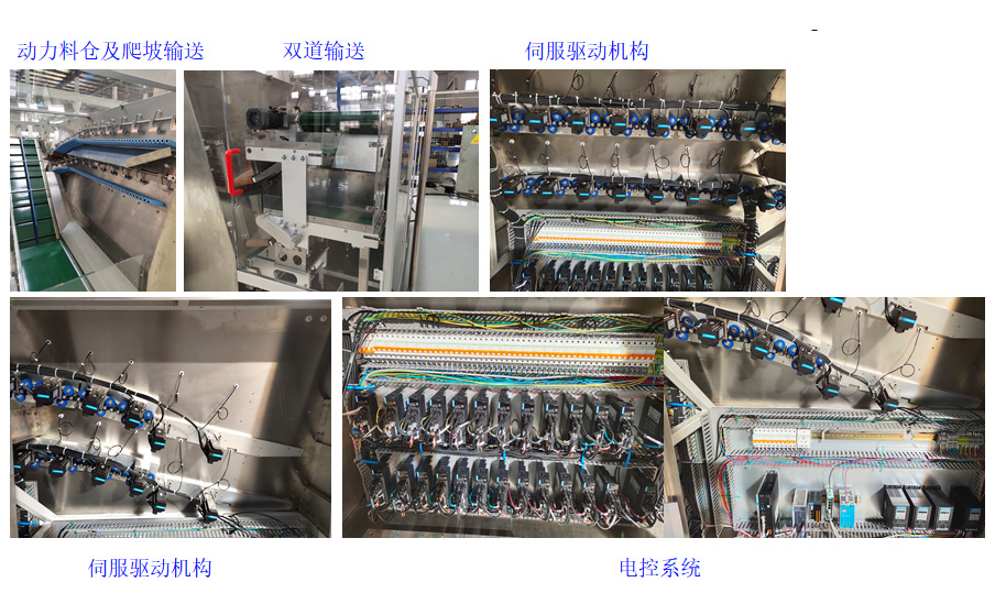 可实现由杀菌出来后(或人工将物料倒入料仓)输送至料仓,通过伺服控制系统将混乱物料智能的整理成有序排列,可自动装盒(可实现产品翻面、掉头,保证产品所有面及头尾一致,),装袋,装箱等包装方式。